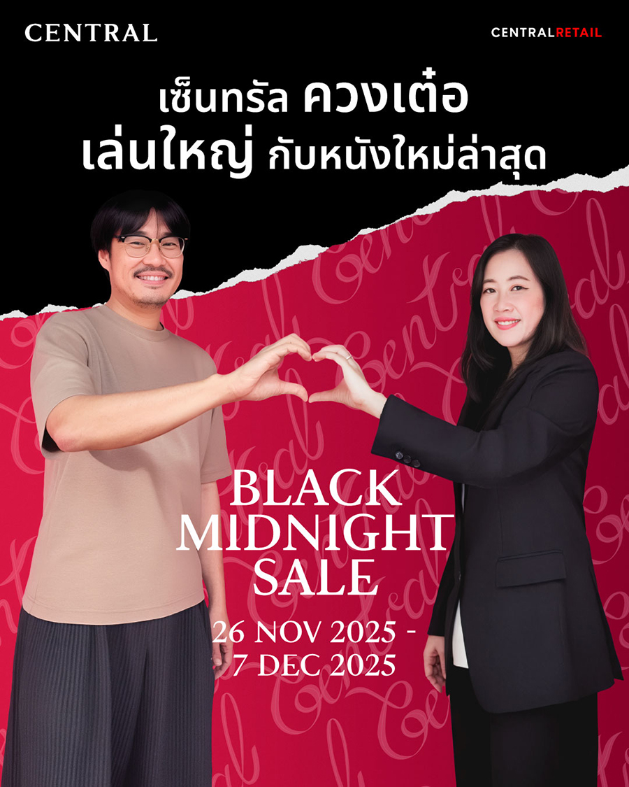 พบกับ ‘Central Black Midnight Sale – เทศกาลแห่งการให้…ตัวเองบ้างก็ได้’ ได้ที่ห้างเซ็นทรัลทุกสาขา, Central App, www.central.co.th และช่องทางช้อปปิ้งสุดสะดวกทั้ง Central Chat & Shop, Personal Shopper, Central TikTok Shop และ Facebook Live ของห้างเซ็นทรัล พร้อมเซอร์ไพรส์ใหญ่ต้อนรับ Black Friday ลดทุกชั้น ทุกแผนก สูงสุด 70% แลกคะแนนลดเพิ่มสูงสุด 25% จากบัตรเครดิตที่ร่วมรายการ พิเศษเฉพาะ Central App แจก Special Coupon ลดสูงสุด 20% ดีลซื้อ 1 แถม 1 และอีกมากมาย จัดเต็มเพียง 3 วัน ระหว่างวันที่ 28–30 พฤศจิกายน 2568