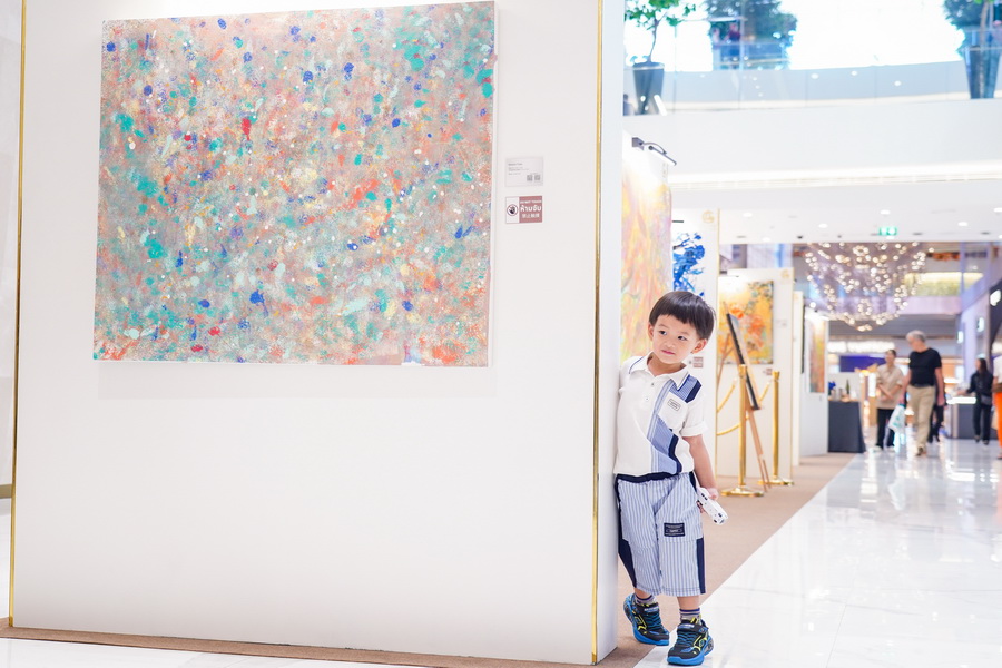 นิทรรศการนำเสนอผลงานพิเศษที่ไม่เคยจัดแสดงที่ใดมาก่อน อาทิ ‘Dreaming of London Bridge’ ผลงานที่สะท้อนแรงบันดาลใจจากความฝันอยากไปลอนดอน ถ่ายทอดทัศนียภาพสะพานชื่อดังด้วยอารมณ์แบบศิลปะนามธรรม, ‘Shinkansen in the Rain Tunnel’ ที่เริ่มต้นจากผืนแคนวาสสีดำเพื่อสร้างมิติอุโมงค์และความเร็วของรถไฟ, ‘Butterflies Swim’ ที่เปลี่ยนการเล่นเป็นภาษาศิลป์ผ่านร่องรอยของรถของเล่น และ ‘Christmas Candle’ ที่ ใช้การลากสีด้วยอุปกรณ์หลากหลายรวมถึงสองมือ เพื่อสื่อถึงความอบอุ่นของเทศกาลแห่งความสุขอย่างเป็นธรรมชาติ