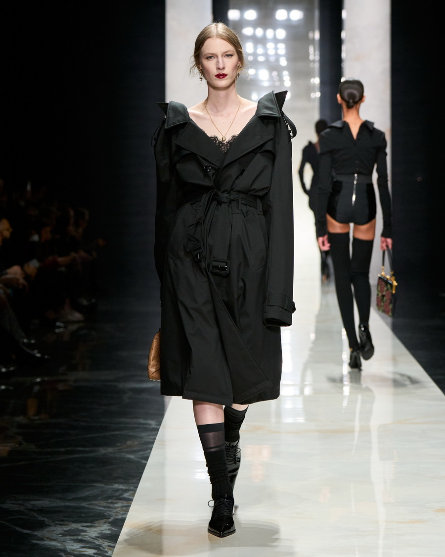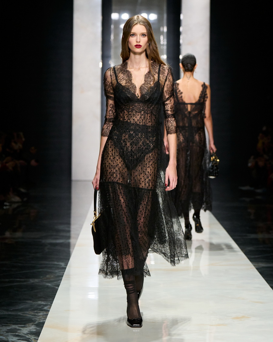 ภายในคอลเลกชัน เสื้อผ้าได้รับการออกแบบให้สะท้อนโครงสร้างแบบคลาสสิกของแบรนด์ ไม่ว่าจะเป็นแจ็กเก็ตทรง Dolce ที่เน้นเส้นสายสะโพกอย่างสง่างาม เบลเซอร์โอเวอร์ไซซ์ที่เผยลูกไม้ด้านในอย่างแยบยล ไปจนถึงเนกไทและเสื้อเชิ้ตสีขาวที่เติมกลิ่นอายของสไตล์แบบบุรุษ ขณะเดียวกันซิลูเอตแบบแนบกระชับและเดรสเลเยอร์น้ำหนักเบาก็สร้างสมดุลระหว่างความแข็งแรงของโครงสร้างและความพลิ้วไหวของสัดส่วน ลวดลายดอกไม้สีขาวที่เบ่งบานบนผ้าสีดำเนื้อบางช่วยเพิ่มมิติของความโรแมนติก ขณะที่งานปักและรายละเอียดระยิบระยับช่วยเติมความเจิดจรัสให้กับแต่ละลุคอย่างประณีต