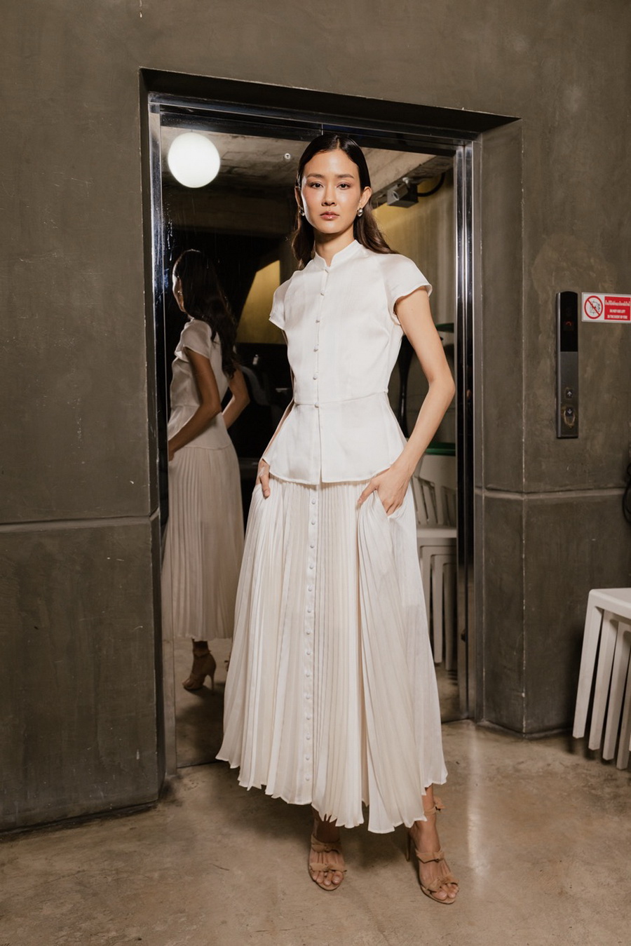 คอลเลกชันประกอบด้วยไอเทม 14 ชิ้น นำเสนอในโทน Soft Neutral แทรกด้วยชิ้นสีฟ้าโดดเด่น พร้อมดีเทล Chinoiserie อันเป็นเอกลักษณ์ ทั้งคอจีน งานกระดุม และเส้นสายที่คมชัด ตั้งแต่เดรส กางเกง เสื้อแจ็กการ์ด ไปจนถึงซิลลูเอตที่สวมใส่ง่ายและงดงาม หรูหราแต่ยังคงฟังก์ชันการใช้งานที่ตอบรับไลฟ์สไตล์ผู้หญิงยุคใหม่อย่างแท้จริง