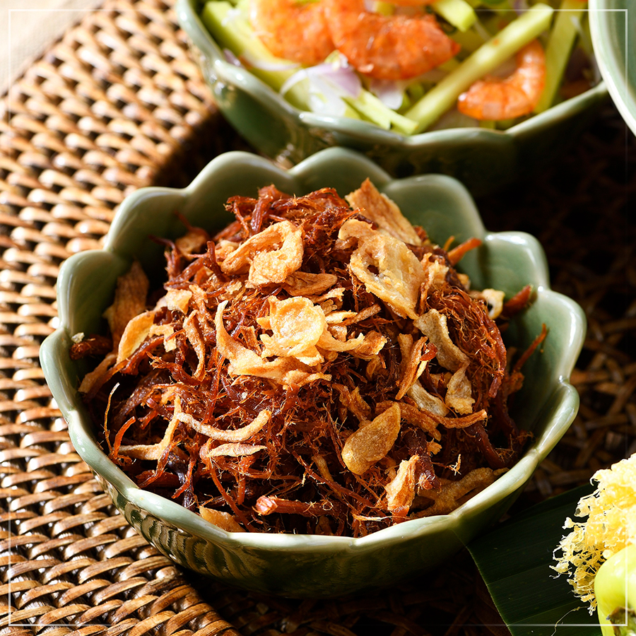 เครื่องเคียงรสเลิศ 7 รายการ คือหัวใจสำคัญของสำรับ ไม่ว่าจะเป็น ลูกกะปิทอด ที่คัดสรรกะปิอย่างดีจากคลองโคลนมาย่างหอม โขลกกับเนื้อปลาดุกย่าง ผัดกับกระชาย ตะไคร้ และข่า ปั้นเป็นก้อนพอดีคำ ชุบไข่ทอดจนสีเหลืองทอง รับประทานคู่กระชายสด, หอมแดงไส้ปลายี่สนผัดหวาน ที่ใช้หอมแดงโทนลูกใหญ่คว้านไส้ สอดไส้ปลายี่สนผัดหวาน ก่อนชุบแป้งทอดจนกรอบ, พริกหยวกสอดไส้ หมูบดผสมกุ้งสับปรุงรสด้วยรากผักชี กระเทียม และพริกไทย ห่อด้วยแพไข่ทอดสีเหลืองน่ารับประทาน, ไชโป๊วผัดหวาน ที่ผัดกับน้ำตาลโตนดและน้ำมันหอมเจียวจนได้เนื้อใสมันวาว, หมูฝอยหรือเนื้อฝอย นึ่ง ฉีก ทอด และผัดเคลือบน้ำตาลโรยหอมเจียว, ยำมะม่วงกุ้งเสียบ ผสานมะม่วงเขียวเสวยและมะม่วงแรด คลุกเคล้าน้ำยำรสจัดจ้าน เติมเต็มด้วยกุ้งเสียบทอดกรอบ และผักเครื่องเคียงอย่างกระชายสด มะม่วงดิบ และผักสดอื่นๆ ที่ช่วยชูรสเครื่องเคียงให้โดดเด่นยิ่งขึ้น