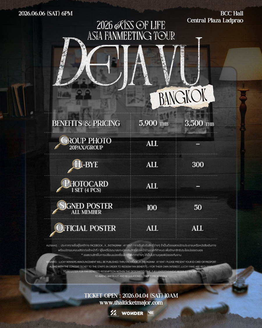 ขณะเดียวกัน อีกหนึ่งไฮไลต์ที่แฟนชาวไทยไม่ต้องลุ้น คือการกลับมาพบกันในงาน ‘2026 KISS OF LIFE ASIA FANMEETING TOUR <DEJA VU> IN BANGKOK’ ซึ่งจะจัดขึ้น ในวันเสาร์ที่ 6 มิถุนายน 2569 เวลา 18:00 น. ณ BCC Hall ชั้น 5 เซ็นทรัลพลาซา ลาดพร้าว โดยผู้จัด Four One One Entertainment ร่วมกับ S2 Entertainment และ WONDER