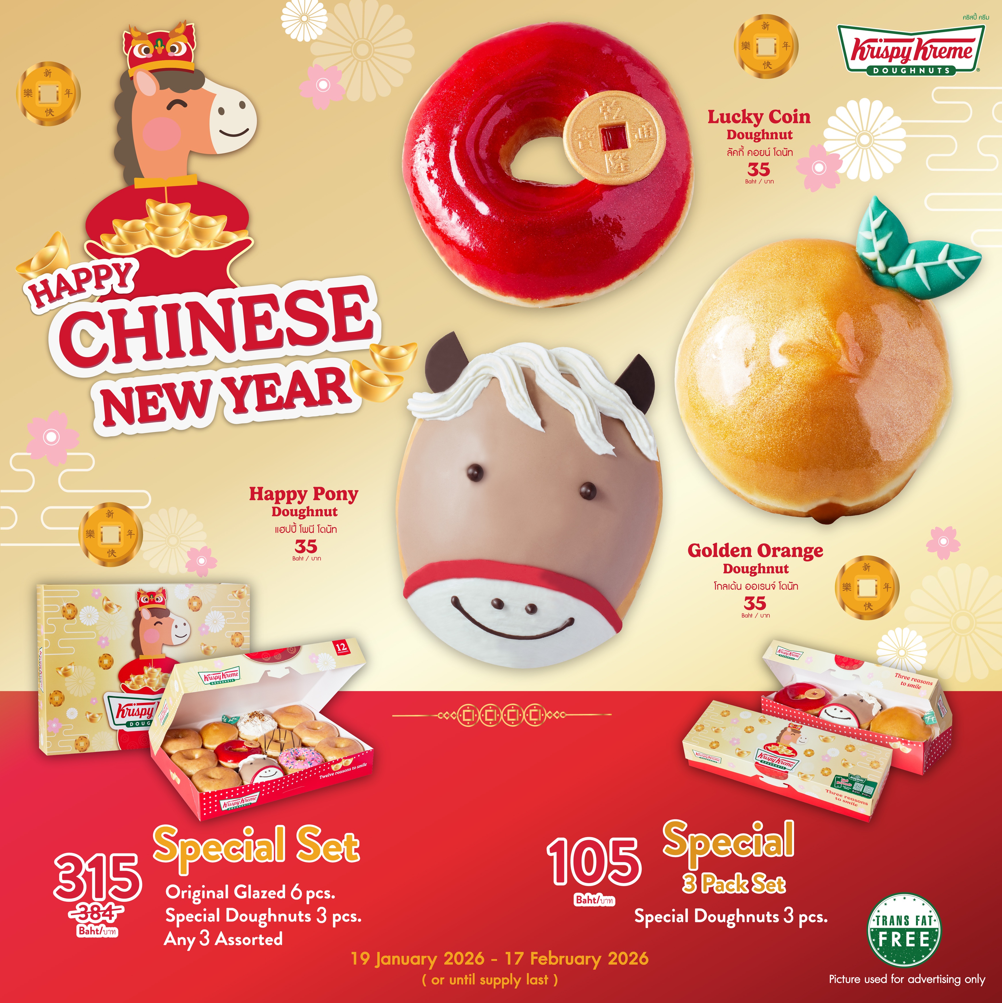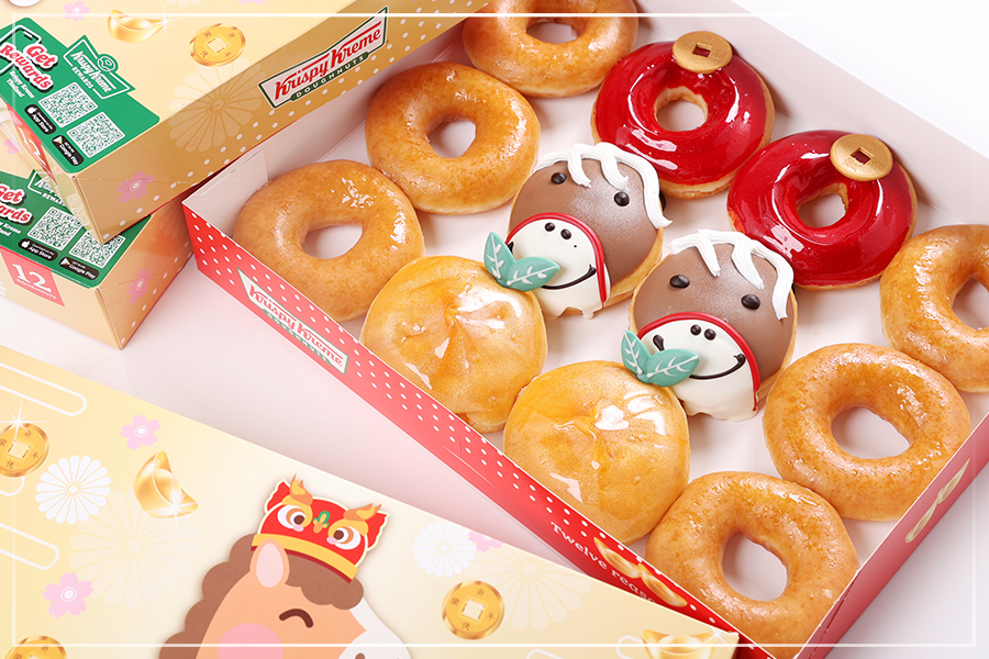ร่วมต้อนรับปีม้าทองด้วยโดนัทมงคลเสริมความสุขตลอดปีกับ ‘Krispy Kreme Happy Chinese New Year Doughnuts’ ราคาเพียงชิ้นละ 35 บาท หรือเลือกซื้อแบบแพ็ก 3 ราคา 105 บาท (แฮปปี้ ไชนีส นิวเยียร์ โดนัท 3 ชิ้น) และแบบเซต ราคา 315 บาท (แฮปปี้ ไชนีส นิวเยียร์ โดนัท 3 ชิ้น, แอสซอร์ทเตท 3 ชิ้น และออริจินอล เกลซ 6 ชิ้น) วางจำหน่ายตั้งแต่วันที่ 19 มกราคม – 17 กุมภาพันธ์ 2569 ณ ร้าน Krispy Kreme ทุกสาขา (ยกเว้นสาขาสนามบินสุวรรณภูมิ, สนามบินดอนเมือง และแอปพลิเคชันฟู้ดดิลิเวอรี)