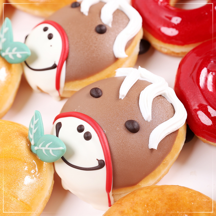 เริ่มต้นด้วย Happy Pony Doughnut (แฮปปี้ โพนี โดนัท) โดนัทดีไซน์รูปม้าน้อยสุดน่ารัก ตัวแทนความสดใสของปีม้าทอง ตกแต่งด้วยช็อกโกแลตไลท์บราวน์ ไวท์ช็อกโกแลต เรดช็อกโกแลต และวิปปิ้งครีมเนื้อนุ่ม พร้อมสอดไส้สับปะรด ผลไม้มงคลที่สื่อถึงความอุดมสมบูรณ์แบบเต็มคำ