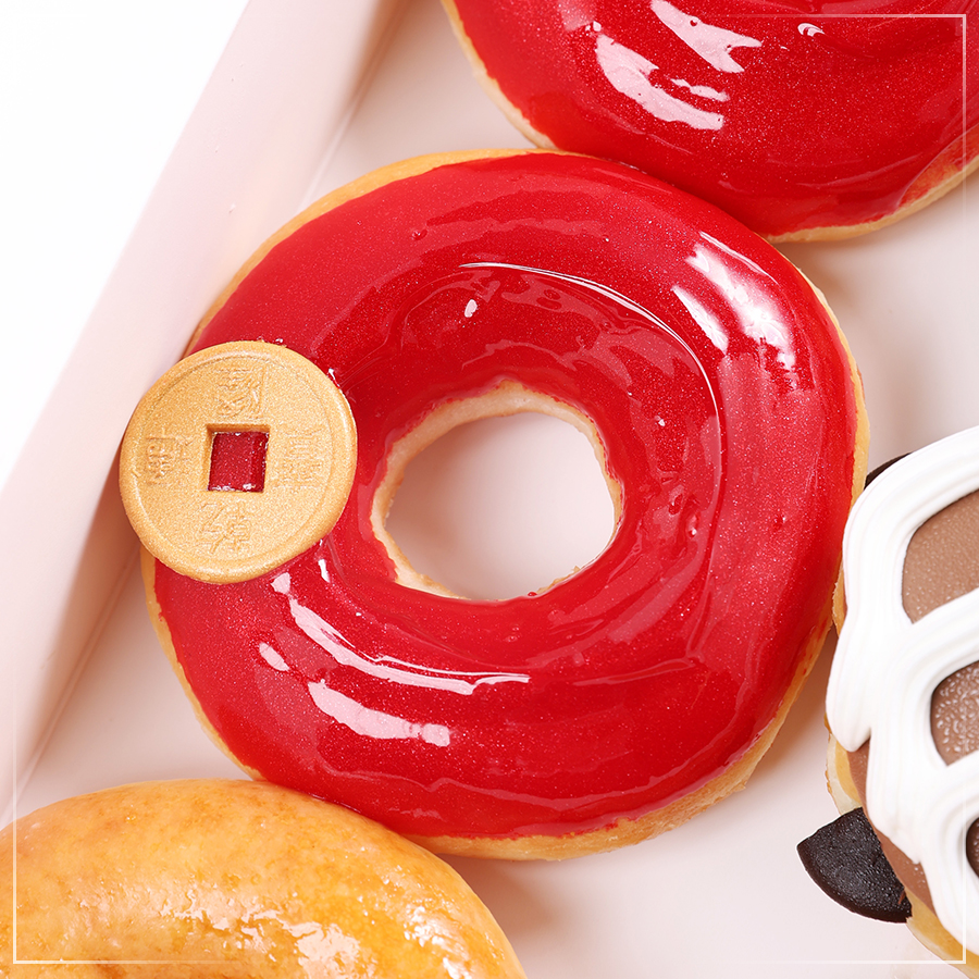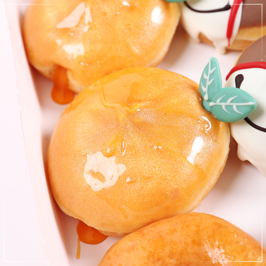 และปิดท้ายด้วย Golden Orange Doughnut (โกลเด้น ออเรนจ์ โดนัท) โดนัทเนื้อนุ่มสอดไส้ส้มฉ่ำ รสเปรี้ยวอมหวาน เคลือบเกลซสีทองระยิบระยับ สื่อถึงผลส้มสีทองที่เป็นตัวแทนของความเจริญรุ่งเรืองและความสำเร็จ