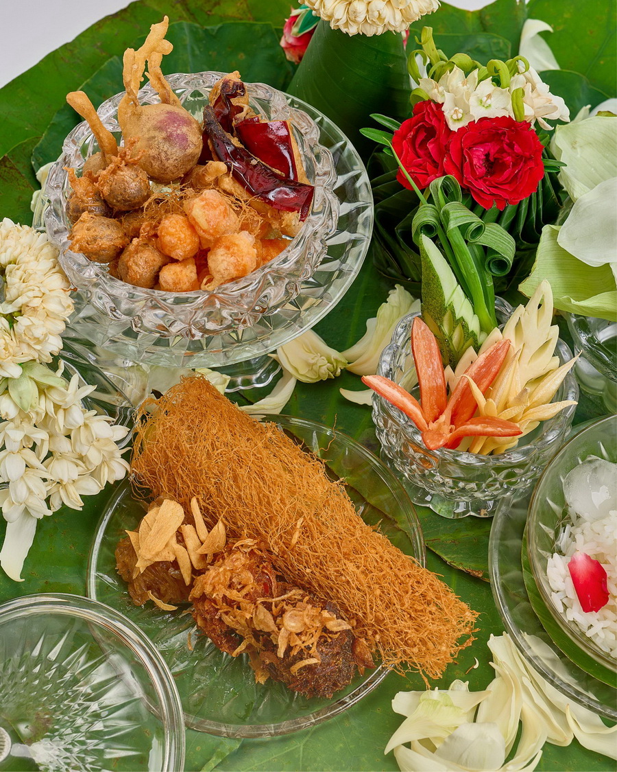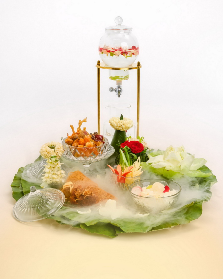สำรับข้าวแช่ในปีนี้รังสรรค์โดย เชฟวิชิต มุกุระ Executive Chef ผู้เชี่ยวชาญด้านอาหารไทยชาววัง ที่ให้ความสำคัญกับรายละเอียดในทุกขั้นตอน ตั้งแต่การคัดสรรข้าวหอมมะลิเสาไห้คุณภาพเยี่ยม นำมาแช่ในน้ำลอยดอกไม้ไทยหอมกรุ่นจากชมนาด กระดังงา กุหลาบมอญ และมะลิ ถ่ายทอดกลิ่นหอมอันเป็นเอกลักษณ์อย่างวิจิตรบรรจง