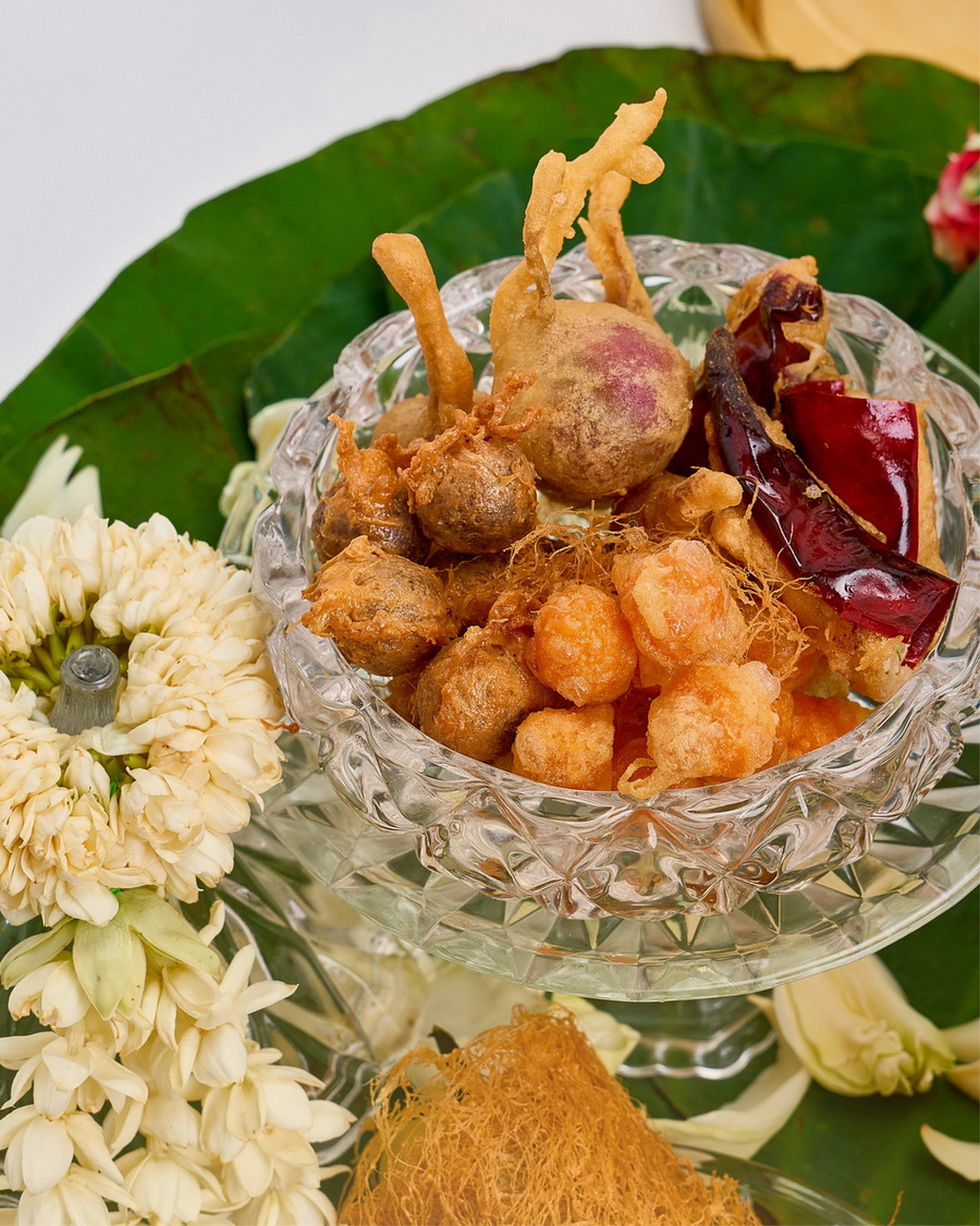 เสิร์ฟพร้อมเครื่องเคียงตำรับชาววัง 8 อย่าง ได้แก่ ลูกกะปิทอด, หอมแดงสอดไส้ปลาแห้ง, พริกหยวกสอดไส้หมูสับและกุ้ง, พริกแห้งสอดไส้ไก่และปลาเค็ม, ไข่แดงเค็มชุบแป้งทอด, หมูฝอยผัดน้ำพริกมะขาม, ปลายี่สนผัดหวาน และหัวไชโป๊วผัดหวาน ซึ่งทุกเมนูล้วนผ่านการปรุงอย่างพิถีพิถัน สะท้อนถึงความละเอียดอ่อนของอาหารไทยทั้งในด้านรสชาติและความงดงามของการจัดวาง