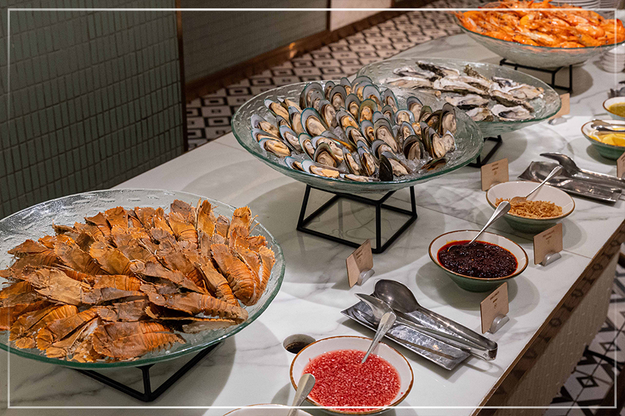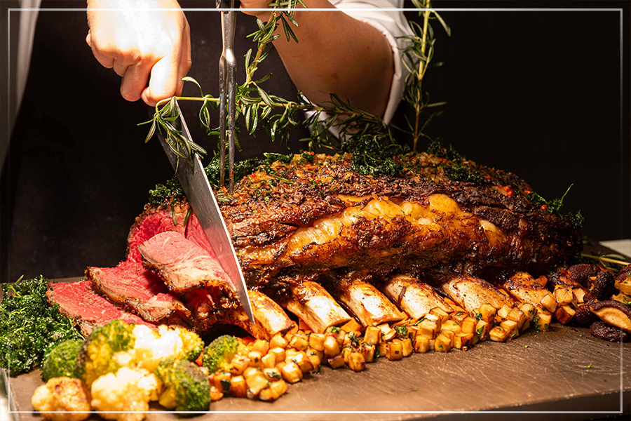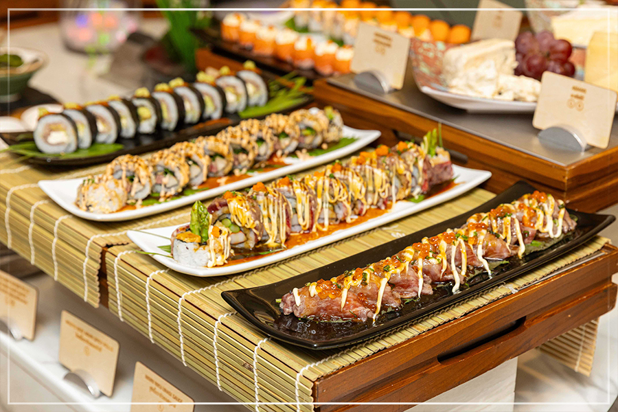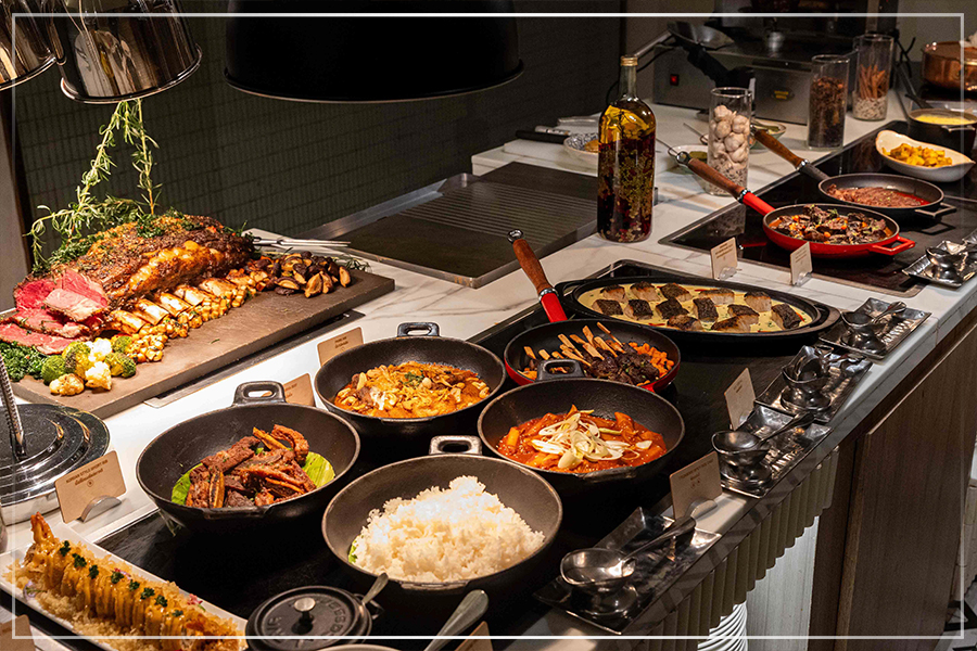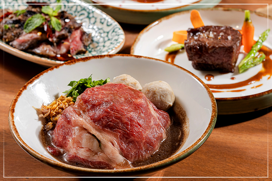 ไฮไลต์ของค่ำคืนนี้คือ Carrara Wagyu วากิวเกรดพรีเมียมจากออสเตรเลีย โดดเด่นด้วยลายไขมันแทรกสวยงาม เนื้อนุ่มละมุนละลายในปาก นำมาตีความเป็นเมนูหลากสไตล์ทั้งอิตาเลียน ไทย และนานาชาติ ไม่ว่าจะเป็นเบอร์เกอร์วากิว ราวิโอลี่สอดไส้หางวัวซอสทรัฟเฟิล สเต็กเนื้อซอสเนยสมุนไพร วากิวคารูบิยากินิกุ ก๋วยเตี๋ยวเรือเนื้อวากิว กะเพราเนื้อวากิว ลิ้นวัวย่าง ไปจนถึงเนื้อวากิวเทอริยากิเสียบไม้ย่าง พร้อมเสริมความครบครันด้วยโคลด์คัท สลัดบาร์ ชีสนานาชนิด ขนมไทย ขนมอบ เค้ก ไอศกรีม และผลไม้ตามฤดูกาล