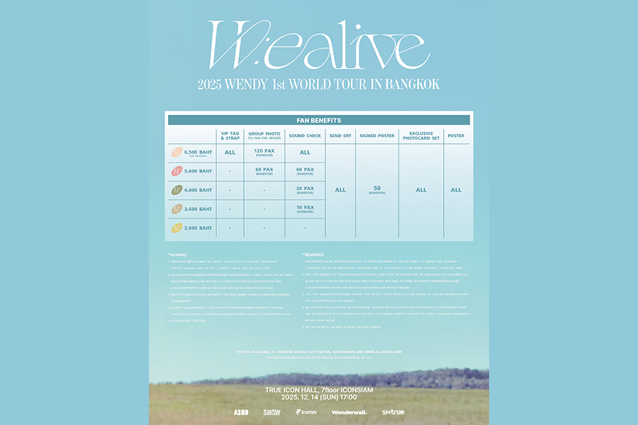 SM True (เอสเอ็ม ทรู) เตรียมพาขอบฟ้าแห่งเสียงเพลงสว่างไสวไปพร้อมกับ ‘WENDY’ (เวนดี้) แห่งวง Red Velvet ในเวิลด์ทัวร์คอนเสิร์ตครั้งแรก ‘2025 WENDY 1st WORLD TOUR <W:EALIVE> IN BANGKOK’ ที่จะจัดขึ้น ณ ทรู ไอคอน ฮอลล์ ชั้น 7 ไอคอนสยาม พร้อมเปิดจำหน่ายบัตรแล้ววันนี้ทางเว็บไซต์ www.allticket.com/event/WENDY_WEALIVEinBKK