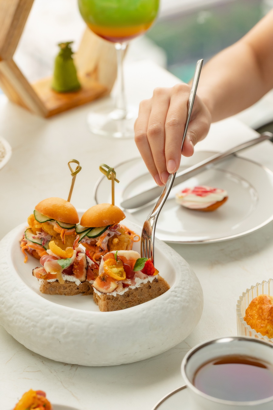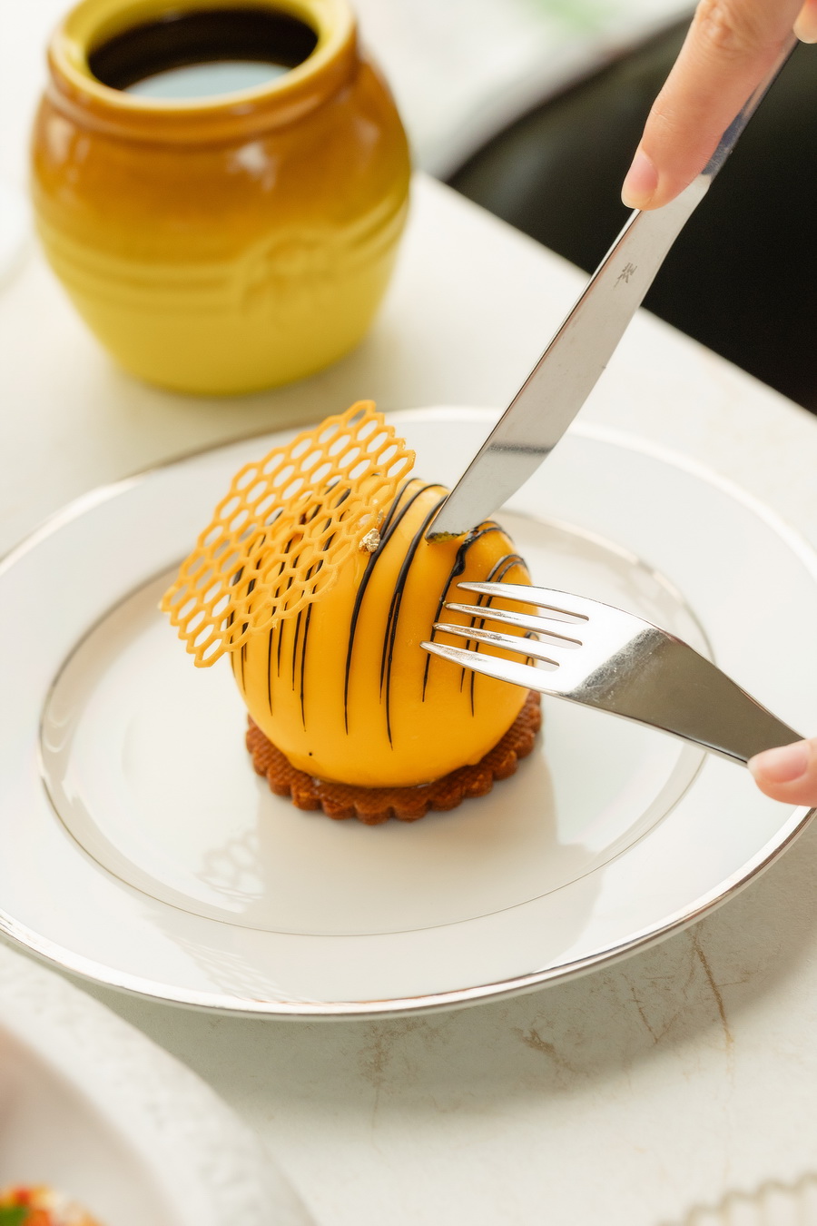 ขนมหวานคัดสรรเพื่อช่วงบ่ายแสนรื่นรมย์ เริ่มด้วยสโคนเลมอนน้ำผึ้ง เสิร์ฟวิปครีมมาสคาร์โปนและเลมอนหมัก ตามด้วยมูสสตรอว์เบอร์รีไลม์กับไวท์ช็อกโกแลตวิปกานาชและสตรอว์เบอร์รี่ตุ๋น ต่อด้วยช็อกโกแลตมูสซอลท์คาราเมลที่จัดเต็มด้วยช็อกโกแลตฟัดจ์ รอยัลไทน์ และคุกกี้ช็อกโกแลตสไตล์ฝรั่งเศส เพิ่มความสดชื่นด้วยโยเกิร์ตน้ำผึ้ง มูสเนื้อเบาคู่สปอนจ์น้ำตาลทรายแดง ตามด้วยมัทฉะยูซุและครีมยูซุน้ำผึ้ง ปิดท้ายด้วยโรสมาเดอลีนเบอร์รี่หอมกลิ่นกุหลาบและราสป์เบอร์รี่สด