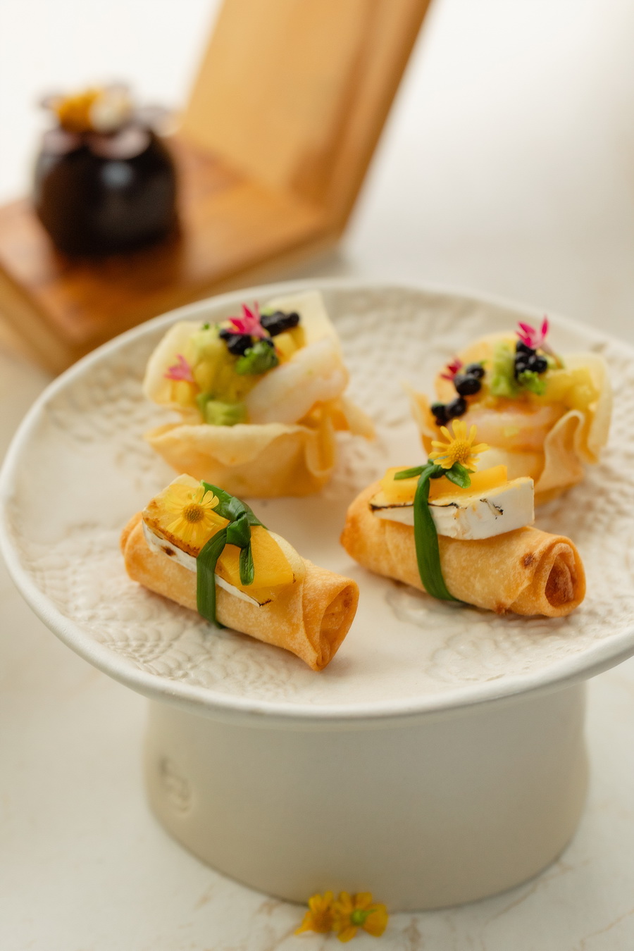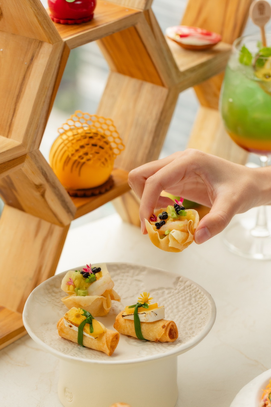 เริ่มต้นด้วยเมนูอาหารคาวเรียกน้ำย่อยที่จัดวางอย่างประณีต อาทิ แฮมอิเบริโกบนขนมปังกรอบธัญพืช เสริมครีมเกาลัดและน้ำผึ้ง, ทาร์ตกุ้งคู่ซัลซ่ามะม่วงอะโวคาโดและคาเวียร์บัลซามิกหมักน้ำผึ้ง, อกเป็ดรมควันเสียบไม้เคลือบน้ำผึ้งดอกลำไย, ซาลาเปาไก่ฮันนีบัตเตอร์รสกลมกล่อม และปอเปี๊ยะกรอบเสิร์ฟกับบรีชีส พีชสด และพริกดองน้ำผึ้ง