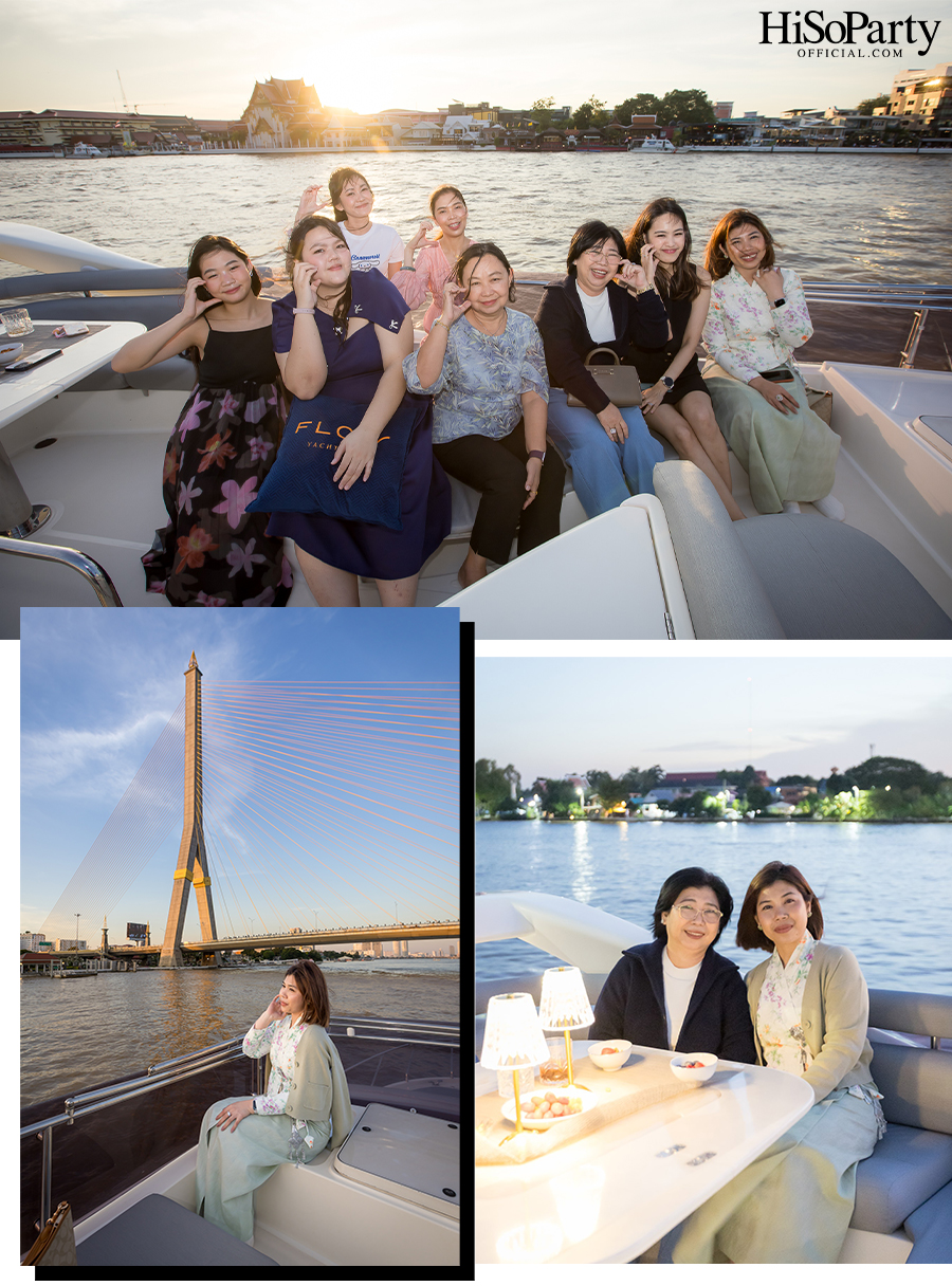 แล้วถึงช่วงเวลาที่ทุกคนรอคอย การล่องเรือยอร์ชส่วนตัวชมพระอาทิตย์ตกเหนือแม่น้ำเจ้าพระยา ท่ามกลางวิวโค้งน้ำที่งดงาม ก่อนดินเนอร์ที่ ร.ศ. ๑๒๗ ‘ในข้าวมีคำ’ ร้านไฟน์ไดนิ่งที่เข้าถึงได้เฉพาะทางเรือเท่านั้น ซึ่งเสิร์ฟอาหารไทยร่วมสมัยที่ตีความจากวัฒนธรรมไทยด้วยฝีมืออันละเมียดละไม จากนั้นเรือยอร์ชส่วนตัวได้พาแขกล่องชมความงามของ งานวิจิตรเจ้าพระยา ที่สะท้อนแสงสีศิลปะบนสายน้ำ และการแสดงโดรนกว่า 1,000 ตัวที่แต่งแต้มท้องฟ้ายามค่ำคืนอย่างตระการตา