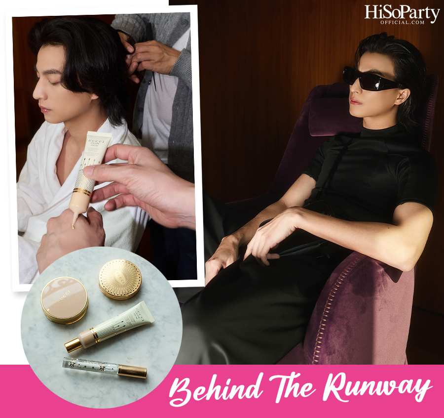โดยเราจะขอพาทุกท่านไปชมเบื้องหลังบิวตี้ลุคของกลัฟ - คณาวุฒิ กันแบบสเต็ปบายสเต็ป เริ่มจากขั้นตอนการเตรียมผิวอย่างพิถีพิถัน จากนั้นเพิ่มความเปล่งประกายด้วย Gucci Glow Skin Tint ที่เป็นเสมือนรองพื้นช่วยขับผิวโกลว์ดูสุขภาพดีอย่างเป็นธรรมชาติ ตามด้วยการเซ็ตลุคให้ละมุนติดทนนานของผิวแมตต์จาก Gucci Matte Powder แล้วยกระดับลุคให้โดดเด่นยิ่งขึ้นด้วยการปัด Gucci Glow Highlighter เฉด #03 Warm Gold มอบความสว่างสดใสประกายมุกให้ทั่วบริเวณโหนกแก้มและโหนกคิ้ว ก่อนเติมความอิ่มแวววาวให้ริมฝีปากด้วยลิปกลอสใส Gloss à Lèvres สี #117 Joslyn Clair พร้อมสเปรย์ผิวหน้าให้ดูฉ่ำน้ำ เปล่งประกายตลอดวัน ด้วย Gucci Brume De Beauté Glow Hydrating Mist เป็นการปิดท้ายลุค