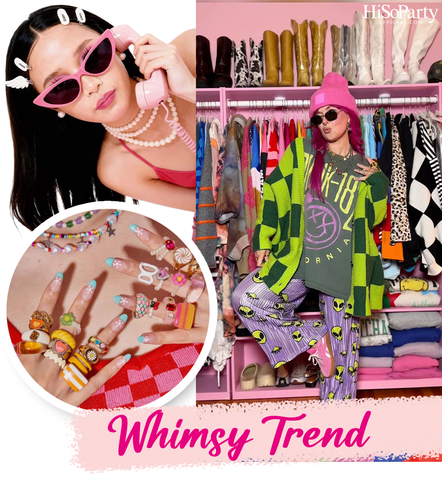WHIMSY หรือ WHIMSY TWEE เป็นเทรนด์แฟชันเน้นความสนุกและความสุขของตัวเอง สามารถนำจินตนามาร่วมในการเติมแต่งลุคให้สนุก น่ารัก เท่ เต็มไปด้วยสีสัน แต่ไม่จริงจังจนเกินไป ท่ามกลางดีเอ็นเอกลิ่นอายในวัยเด็ก ที่มีความเอาแต่ใจและมีหัวศิลปะ เป็นเทรนด์ที่ทำให้เอนจอยกับการมิกซ์แอนด์แมชท์แบบไม่มีที่สิ้นสุด โดยเลือกหยิบจับเสื้อผ้าแต่ละชิ้นที่อยากใส่มาไว้ด้วยกัน ทั้งสีสัน ลวดลาย ไม่กำหนดตายตัว แค่เห็นแล้วมีความสุขที่จะได้ใส่ สื่อสารออกมาผ่านรอยยิ้มพิมพ์ใจสะท้อนความอิ่มเอมความชื่นชอบจากภายใจ สู่การคัดสรรเสื้อผ้าลายจุด ลายการ์ตูน ลายดอกไม้ มารวมเข้าด้วยกัน แล้วเพิ่มความสดใสด้วยสีพาสเทล หรือสีที่โปรดปราน สีไหนก็สนุกได้ เพราะ WHIMSY TWEE คือการเล่าเรื่องตัวเองผ่านสไตลิ่ง เทรนด์นี้จึงไม่ใช่การตามกระแสแบบขอไปที