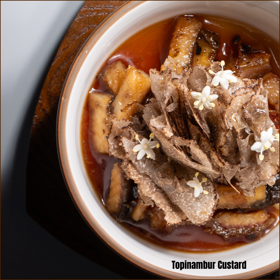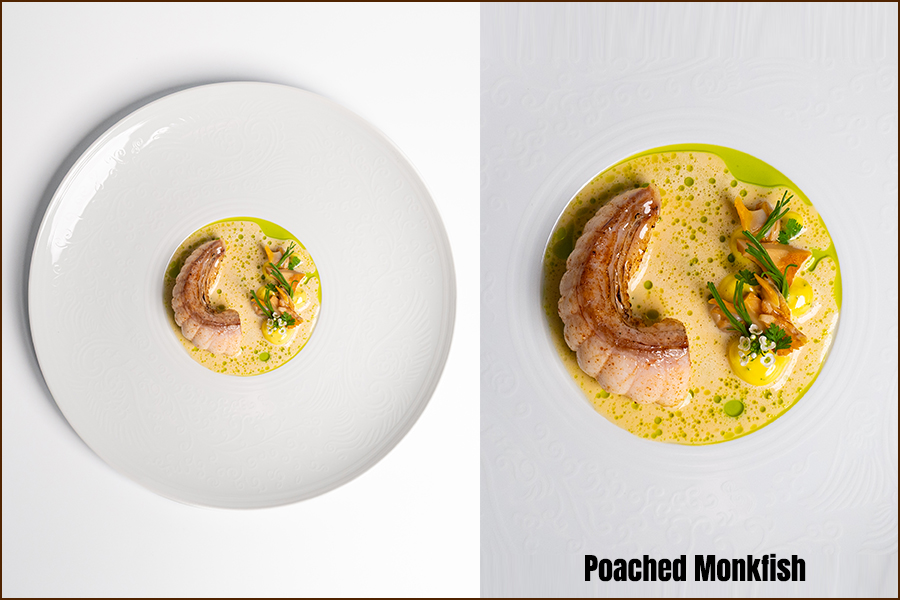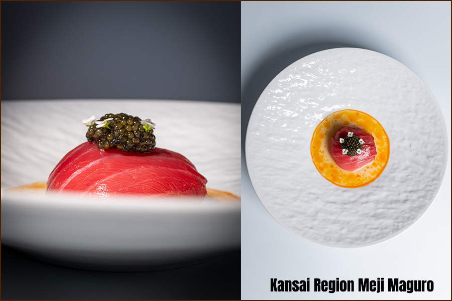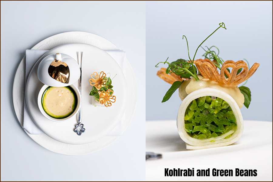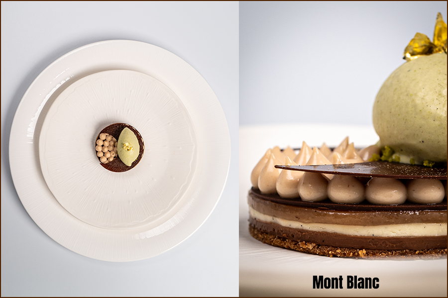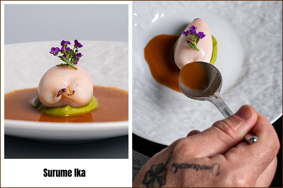 เมนูเปิดด้วย ‘Kansai Region Meji Maguro’ ทูน่าจากคันไซที่จับคู่กับคาเวียร์ โชริโซ (Chorizo) และไอศกรีมข้าวโพด ตามด้วย ‘Kohlrabi and Green Beans’ ที่ผสานแอปเปิ้ลฟูจิ ปลาไหลรมควัน และสมุนไพรฤดูหนาวอย่างสมดุล จานถัดมา ‘Surume Ika’ ปลาหมึกสอดไส้กุ้งหวานอามะเอบิ เสริมรสด้วยซอสเข้มข้นและพริกเอสเปอแล็ตจากฝรั่งเศส ก่อนเข้าสู่ ‘Topinambur Custard’ ที่จับคู่ปลาไหลย่างกับทรัฟเฟิลดำ และ ‘Poached Monkfish’ ที่เสิร์ฟพร้อมเห็ด Chanterelles และซอสเวลูเต้หอยตลับ ปิดท้ายด้วยของหวาน ‘Mont Blanc’ ที่ใช้เกาลัดคุริ มันหวานญี่ปุ่น และไอศกรีมมัทฉะเป็นองค์ประกอบหลัก