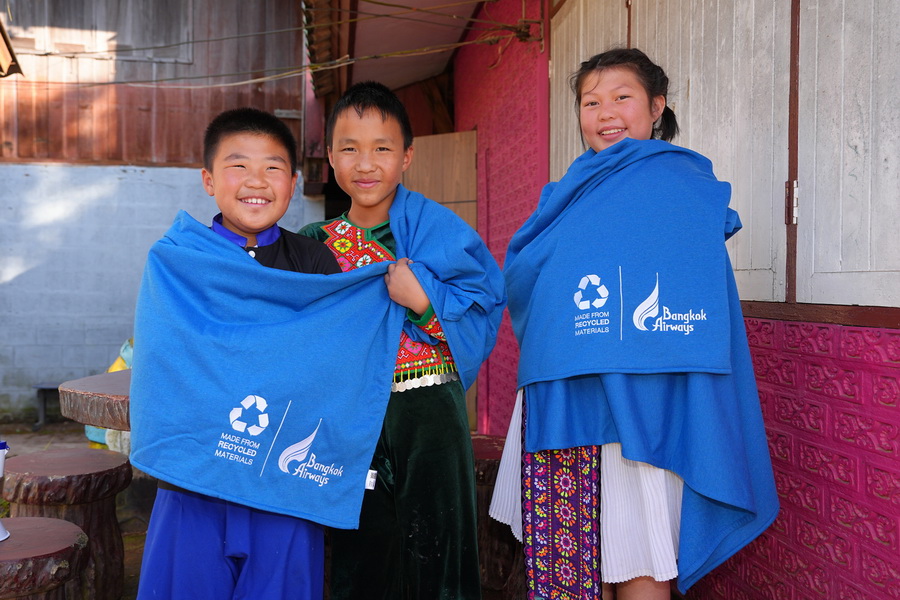ผ้าห่มสีฟ้าที่นำมามอบในกิจกรรมครั้งนี้ ผลิตจากชุดยูนิฟอร์มพนักงานเก่า และขวดน้ำดื่มไร้ฉลากจากการให้บริการบนเที่ยวบิน ผ่านกระบวนการอัพไซคลิงอย่างสร้างสรรค์ ลดปริมาณขยะและเพิ่มการใช้ทรัพยากรอย่างคุ้มค่า โดยช่วยลดคาร์บอนฟุตพรินต์ได้ถึง 358 กิโลกรัม นับเป็นการผสานแนวคำนึงด้านสิ่งแวดล้อมเข้ากับการช่วยเหลือสังคมได้อย่างลงตัว