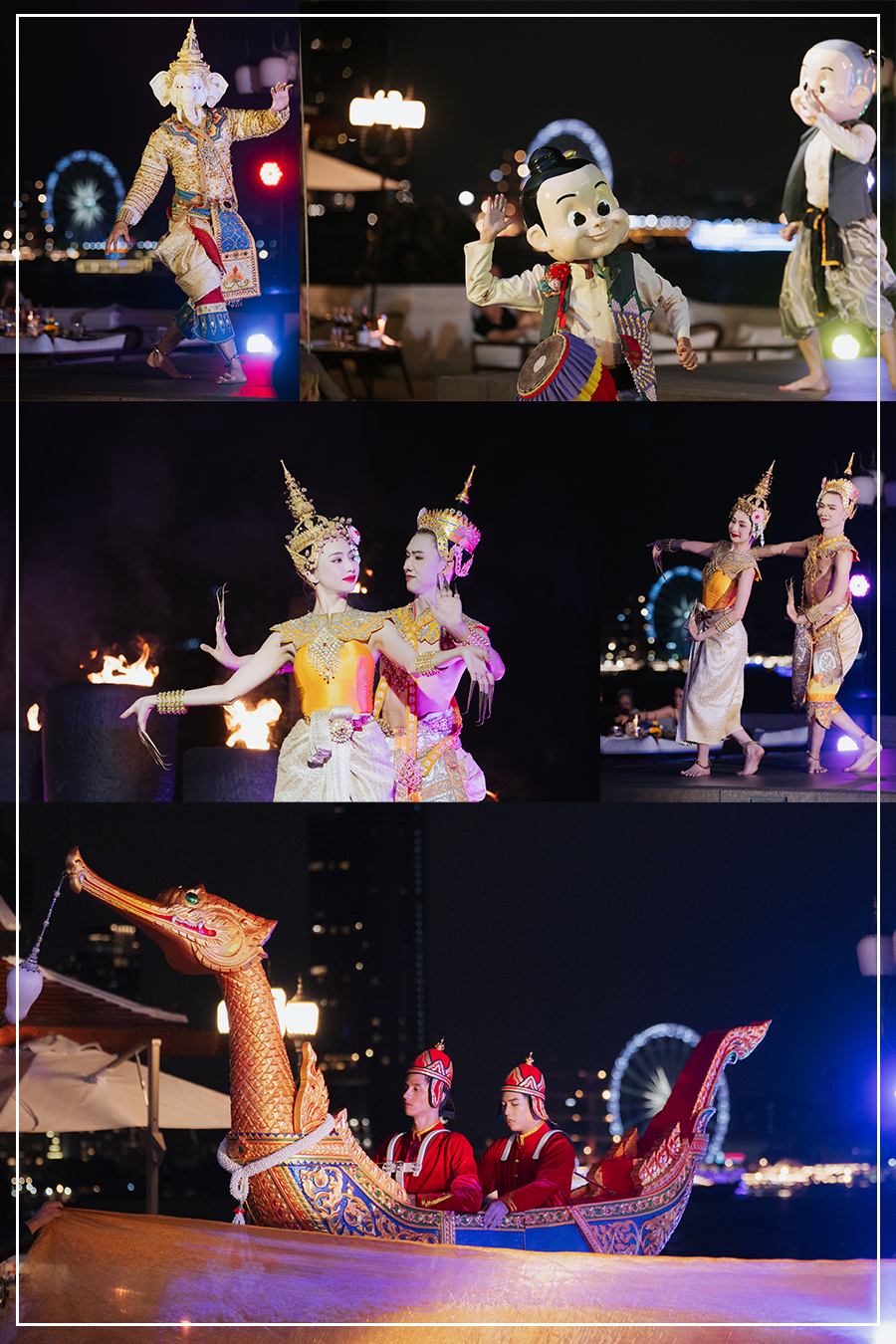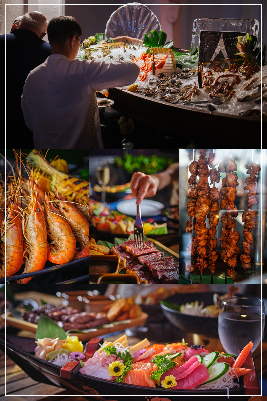 นอกจากจะเพลิดเพลินกับการแสดงสุดตระการตา แขกผู้มาเยือนยังสามารถอิ่มเอมไปกับดินเนอร์บุฟเฟ่ต์นานาชาติที่ผสมผสานมรดกทางอาหารไทยกับเมนูเลิศรสจากทั่วโลก อาทิ สเตชั่นบาร์บีคิวซีฟู้ดที่เสิร์ฟวัตถุดิบชั้นเลิศอย่างกุ้งแม่น้ำ หอยเชลล์ ปูม้า และหอยนางรมฟิน เดอ แคลร์ พร้อมซอสรสเด็ดหลากชนิด อีกทั้งยังมีเมนูไทยยอดนิยม เช่น แกงเขียวหวาน ข้าวผัดกุ้ง ส้มตำ ยำส้มโอ ต้มยำกุ้ง และไข่เจียวปู รวมถึงโซนอาหารนานาชาติทั้งญี่ปุ่น อินเดีย เวียดนาม และไชน่าทาวน์ที่มีข้าวมันไก่ไหหลำ ข้าวหมูแดง หมูกรอบ พร้อมของหวานทั้งขนมไทยคลาสสิกอย่างทองหยอด ฝอยทอง ลูกชุบ ไปจนถึงเค้ก เครป และชูโรสสูตรพิเศษ