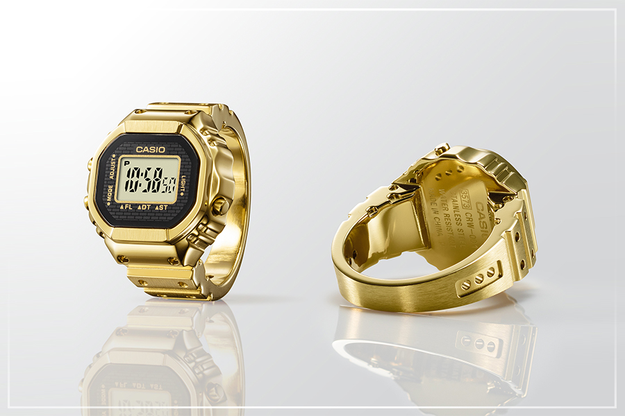 Casio ฉลองโอกาสครบรอบ 50 ปี ด้วยการเปิดตัว ‘Ring Watch รุ่น CRW-001G-9DR’ ตัวเรือนสีทองสุดหรูต่อยอดจากรุ่นสีเงิน CRW-001-1DR ที่ได้รับความนิยมอย่างสูงในปีที่ผ่านมา โดยดีไซน์ใหม่ยังคงคอนเซ็ปต์แหวนนาฬิกาแบบมินิมัล ผลิตจากสแตนเลสสตีลด้วยเทคโนโลยีฉีดขึ้นรูปโลหะขั้นสูง (Metal Injection Molding) พร้อมการชุบไอออนสีทองที่ให้ผิวสัมผัสเงางาม โครงสร้างแบบโมโนค็อกและเทคนิคการยึดติดกระจกแบบพิเศษช่วยเพิ่มความแข็งแรงและกันน้ำได้ดี จึงสวมใส่ใช้งานในชีวิตประจำวันได้อย่างมั่นใจไม่ต่างจากนาฬิกา G-SHOCK รุ่นมาตรฐาน แม้จะมาในรูปแบบแหวนนาฬิกาขนาดเล็กก็ตาม