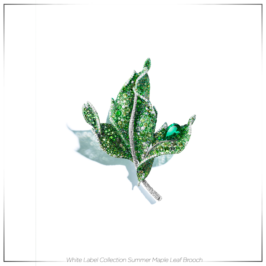 อีกหนึ่งบทสำคัญของคอลเลกชัน คือ The Four Seasons Maple Leaves เข็มกลัดรูปใบเมเปิลที่ถือกำเนิดจากความประทับใจในเสี้ยววินาทีที่แสงอาทิตย์ลอดผ่านใบไม้ ภาพนั้นถูกบันทึกไว้ผ่านโครงสร้างสามชั้นที่สื่อถึงการพลิ้วไหวอย่างอ่อนโยน ใบไม้ทุกใบบ่มเพาะจากการปั้นขี้ผึ้งด้วยมือ ก่อนหล่อขึ้นเป็นโลหะโดยช่างฝีมือชั้นสูงจากยุโรป เพื่อคงไว้ซึ่งพลังชีวิตของรูปทรงดั้งเดิม