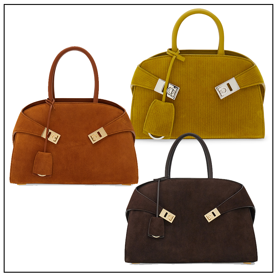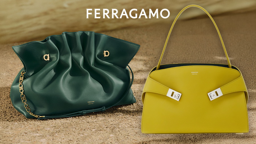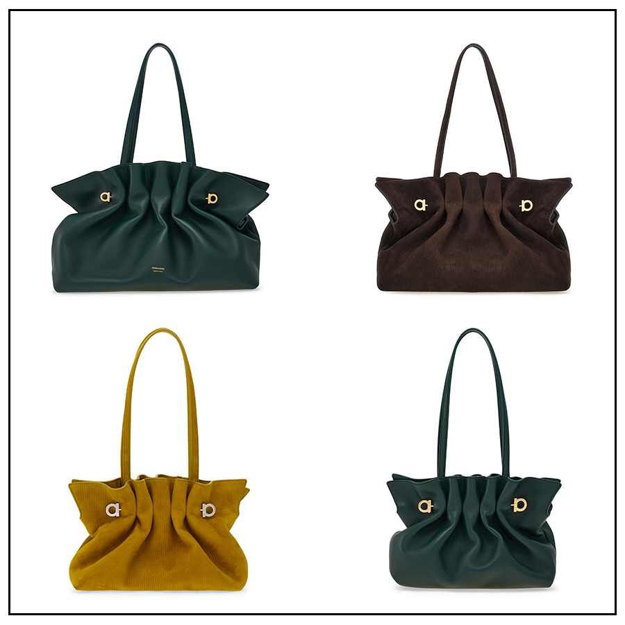 ส่วน Hug Bag โดดเด่นด้วยสายรัดด้านข้างสองเส้นที่โอบกระเป๋าด้านหน้าเสมือนอ้อมกอด ถ่ายทอดเอกลักษณ์ของงานฝีมือชั้นสูงผ่านหนังนุ่มสองโทนสีที่รังสรรค์อย่างพิถีพิถัน พร้อมตัวล็อก Gancini แบบสมมาตรอันเป็นสัญลักษณ์ของแบรนด์ รุ่นนี้มีให้เลือกทั้งแบบสะพายไหล่และแบบครอสบอดี้ด้วยสายสะพายที่ปรับระดับและถอดออกได้ รวมถึงแบบหูหิ้วสองสายที่ทำจากหนังกลับพิมพ์ลายสัมผัสกำมะหยี่ มีให้เลือกในโทนสีน้ำตาลเข้ม สีน้ำตาลอ่อนโทนอุ่น และสีเลมอนกราสอันอ่อนโยน