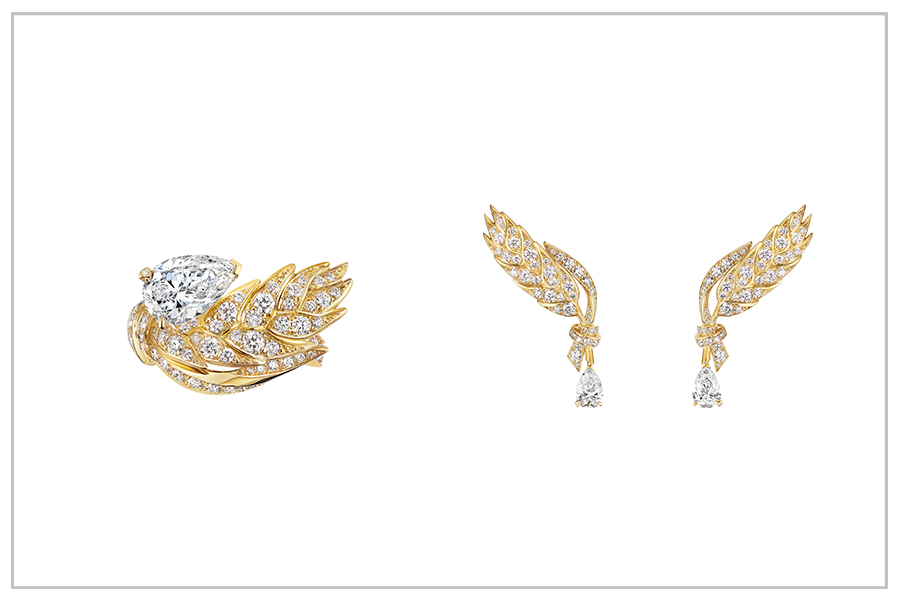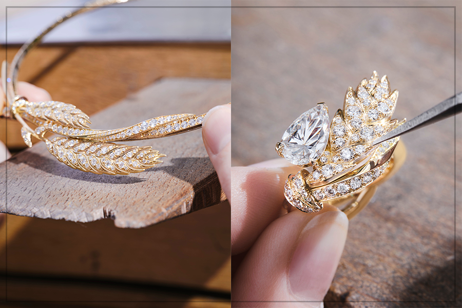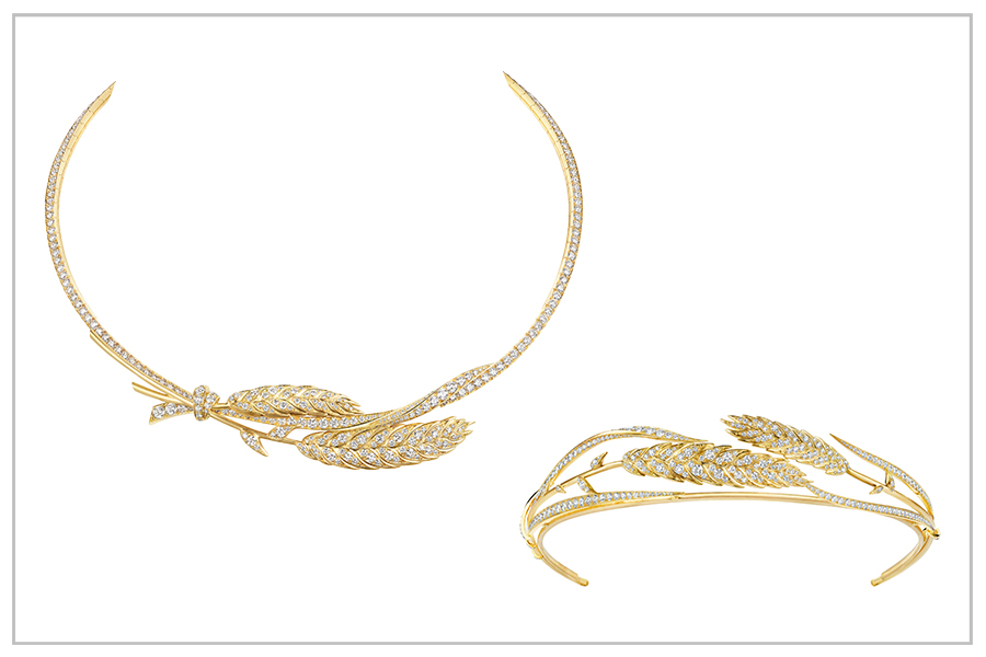 ผลงานไฮจิวเวลรีคอลเลกชันนี้เปรียบเสมือนการสดุดีต่อธรรมชาติและบทกวีแห่งชีวิต ถ่ายทอดลวดลายรวงข้าวที่เคยเป็นที่โปรดปรานของจักรพรรดินี Joséphine และจักรพรรดินี Marie-Louise ให้กลับมามีชีวิตอีกครั้ง ผ่านงานฝีมือที่ละเอียดประณีตในทุกองค์ประกอบ ตั้งแต่เทียราร่วมสมัยทรง Bandeau ที่เผยเส้นสายอันอ่อนช้อย สร้อยคอที่จำลองรายละเอียดของรวงข้าวอย่างวิจิตร ไปจนถึงแหวนที่เปล่งประกายด้วยเพชรทรงลูกแพร์ 2 กะรัต และต่างหูฝังเพชรทรงเดียวกันข้างละ 1 กะรัต