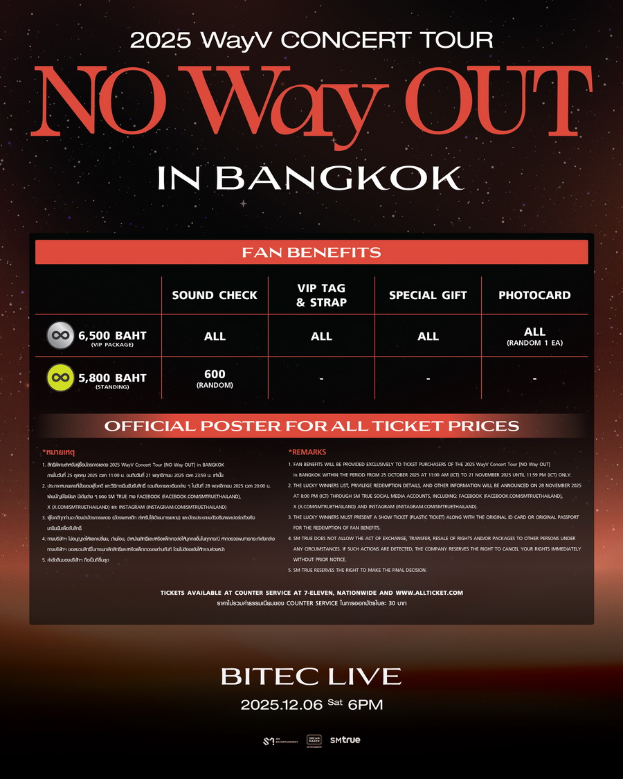SM True ประกาศข่าวใหญ่ที่สะเทือนทุกเส้นทางการเดินทางของแฟนเพลงทั่วประเทศ ด้วยการพา WayV (เวย์วี) กลับมาสู่เวทีประเทศไทยอีกครั้ง ในคอนเสิร์ตเต็มรูปแบบครั้งที่ 2 ‘2025 WayV Concert Tour [NO Way OUT] in BANGKOK’ ซึ่งจะจัดขึ้น ในวันเสาร์ที่ 6 ธันวาคม 2025 เวลา 18:00 น. ณ ไบเทค ไลฟ์ กรุงเทพฯ การกลับมาครั้งนี้ไม่ได้เป็นเพียงการจัดคอนเสิร์ต แต่คือการประกาศพลังของ WayV สู่ยุคใหม่แห่งโลกดนตรี ด้วยเวทีที่อัปเกรด โปรดักชันเข้มข้น และโชว์ที่ถูกออกแบบเพื่อนำพาผู้ชมเข้าสู่จักรวาลทางดนตรีที่ ‘ไม่มีทางออก’ นอกจากการปล่อยใจไปกับเวย์วีตลอดโชว์