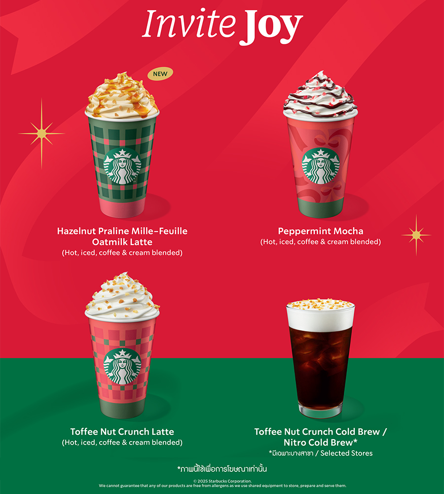 โดยปีนี้นำเสนอเมนูไฮไลต์ Hazelnut Praline Mille-Feuille Oatmilk Latte เครื่องดื่มเอสเพรสโซ่สูตรพิเศษที่ได้รับแรงบันดาลใจจากขนมอบฝรั่งเศส ผสานความหอมของซอสเฮเซลนัท พราลีน และโอ๊ตมิลค์นุ่มละมุน ท็อปด้วยวิปครีมและท็อปปิ้งมีล-เฟยกรุบกรอบ ให้เลือกอร่อยได้ทั้งแบบร้อน เย็น และปั่น นอกจากนี้ยังมีเครื่องดื่มยอดนิยมกลับมาอีกครั้ง ทั้ง Peppermint Mocha รสช็อกโกแลตผสมน้ำเชื่อมเปปเปอร์มิ้นท์ให้ความสดชื่นของฤดูหนาว, Toffee Nut Crunch Latte ที่หอมกรุ่นกลิ่นถั่วอบนุ่มละมุน และ Joyful Medley Full Leaf Brewed Tea ชาคุณภาพเยี่ยมเบลนด์จากชาดำ ชาเขียว และชาอู่หลง กลิ่นแอพริคอตหอมสดชื่น โดยในปีนี้เพิ่มทางเลือกใหม่ Joyful Medley Tea Latte ทั้งแบบร้อนและเย็น เติมเต็มความสดชื่นในช่วงเทศกาลได้อย่างลงตัว