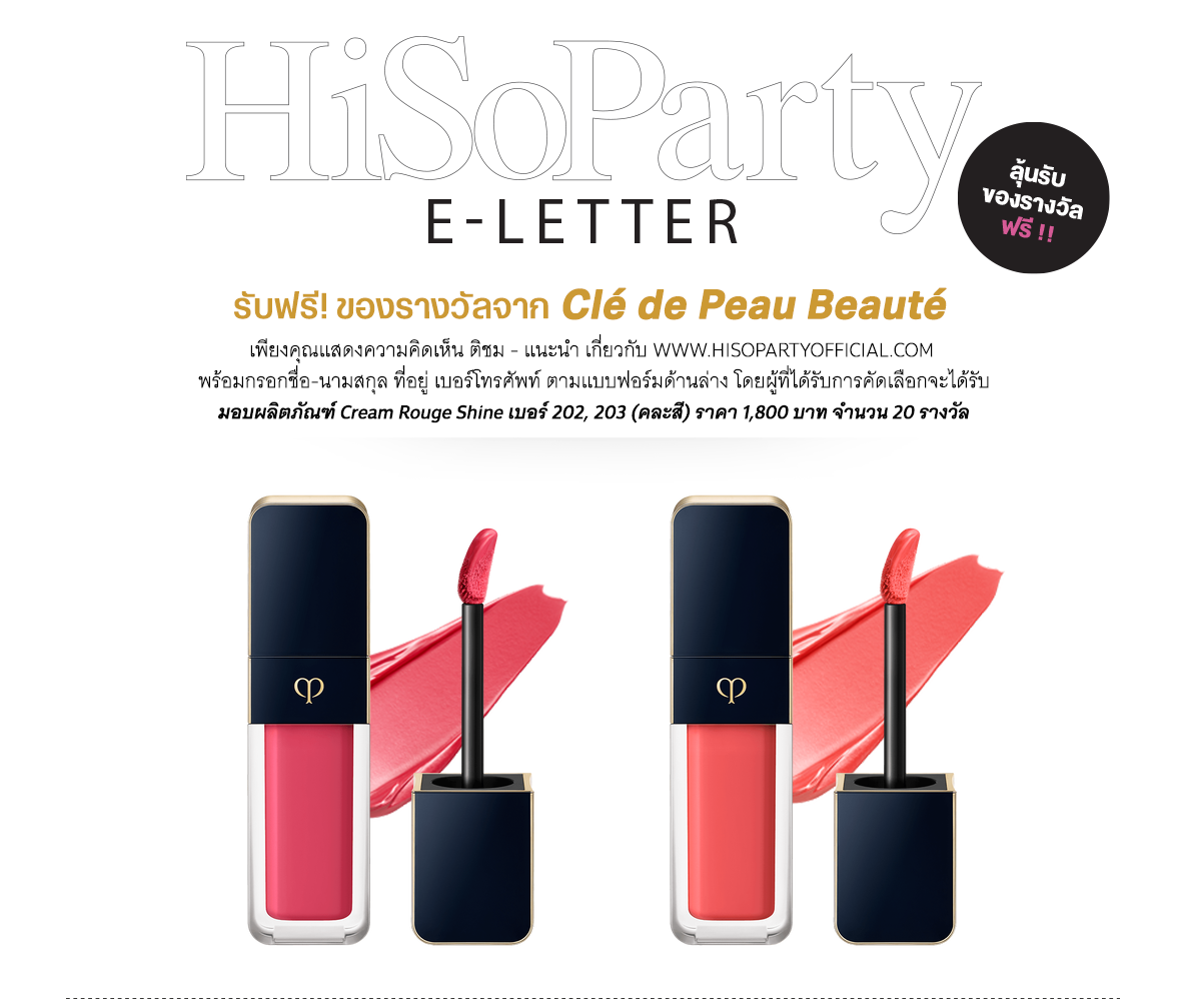มอบผลิตภัณฑ์ Cream Rouge Shine เบอร์ 202, 203 (คละสี) ราคา 1,800 บาท จำนวน 20 รางวัล