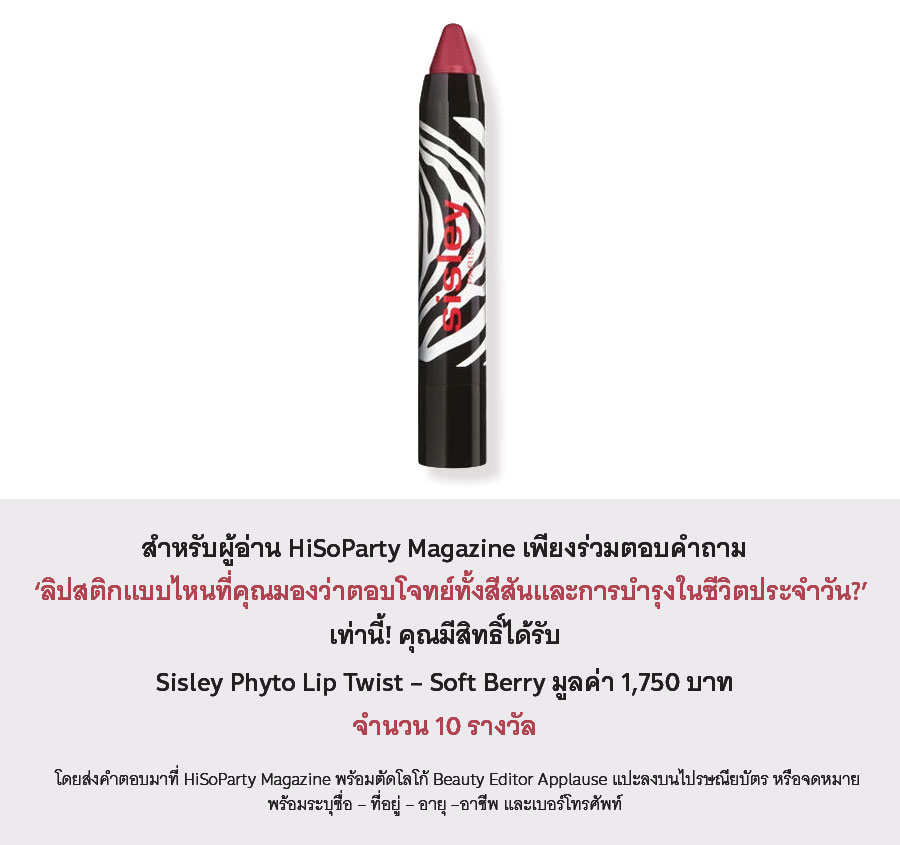 Sisley (ซิสเลย์) แบรนด์สกินแคร์และความงามระดับไฮเอนด์จากฝรั่งเศสขอส่งต่อไอเทมที่ผสานทั้งสีสันและการบำรุงอย่างลงตัวกับ Sisley Phyto Lip Twist – Soft Berry ลิปสติกเนื้อสัมผัสบาล์มที่ให้สีสดชัดในแบบลิปสติกพร้อมความเงางามดุจลิปกลอส เพียงบิดแท่ง ‘Twist’ สีสันก็พร้อมใช้งานทันที มอบความชุ่มชื่น เรียบเนียน และช่วยให้เรียวปากดูอวบอิ่ม ด้วยคุณค่าการบำรุงจากพืชธรรมชาตินานาชนิด เนื้อสีเนียนลื่นละมุน พร้อมดีไซน์แท่งทรงดินสอสีไซซ์ XXL ที่ใช้ง่ายและสนุกในทุกโอกาส